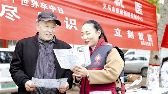 10月29日,义马市疾控中心联合义马市人民医院、银杏、鸿庆路、新区、千秋矿社区卫生服务机构,在珠江路开展以“尽早识别,立刻就医”为主题的第20个世界卒中日宣传义诊活动。图为医护人员与社区志愿者在见义勇为主题公园开展健康咨询义诊活动,并发放健康知识宣传彩页,受到群众好评。 赵韶伟 摄