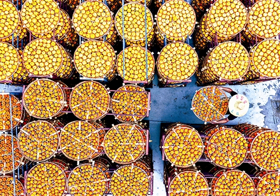 11月1日,广西桂林市平乐县二塘镇牛角村村民在晾晒柿子(无人机照片)。
