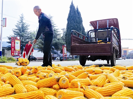 近日,在市城乡一体化示范区(高新区)阳店镇的乡村,农户紧抓晴好天气,将收获的玉米等农作物铺晒在屋前屋后,斑斓的色彩与田园风光融为一体。图为农户手持农具,将玉米卸车晾晒。 彭红勇 摄