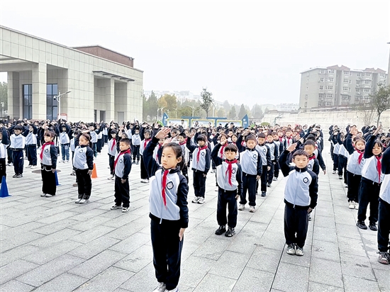 10月31日,三门峡市阳光小学教育集团北环路校区举办达标运动会。操场上,学生精神抖擞,用行动诠释体育精神。图为《保卫黄河》体操展示。 马晓庆 摄