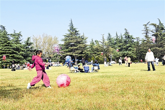 11月2日,天气晴朗,三门峡经济开发区陕州公园大草坪上孩子们奔跑欢笑,家长们相伴互动,满是温馨惬意。 本报记者 李秀芝 摄