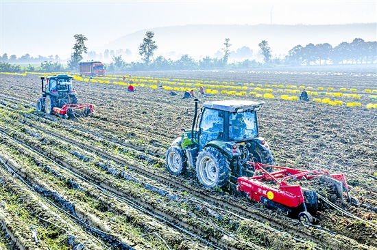 11月2日,秋高气爽,阳光明媚,灵宝市西阎乡黄河滩涂上农机轰鸣,一农业专业户趁着天气放晴抢收红薯。近日天气晴好,我市各地农民积极行动,迅速展开抢收,力争秋粮应收尽收。 杜杰 摄