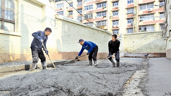 11月4日,湖滨区老城区排水防涝设施建设改造项目现场,施工人员正在建设路七街坊局东小区进行地面硬化作业,旨在进一步完善小区排水系统,助力老城区居住环境升级。 尚栋 摄
