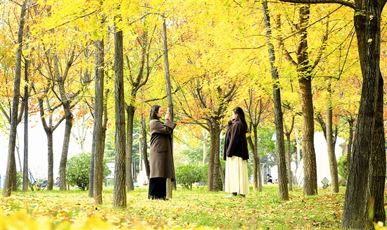 11月3日,三门峡天鹅湖国家城市湿地公园周公岛上,树木已然换上五彩斑斓的“秋装”。金黄的银杏叶、火红的枫叶……绚烂的景致吸引市民与游客前来观赏拍照,感受浓浓秋意。 尚栋 摄