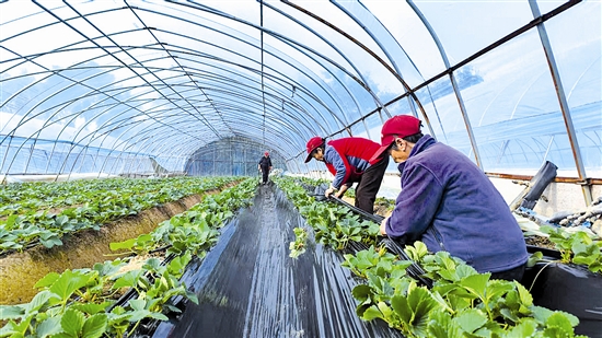 11月4日,在湖滨区崖底街道西贺家庄村的草莓大棚内,种植人员忙着给草莓植株覆盖黑色地膜,为即将到来的草莓盛产期打牢基础。 尚栋 摄