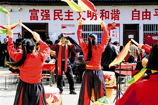 11月4日,在卢氏县官道口镇石大山村文化活动中心,群众为老人们表演自编自演的文化节目,弘扬孝老爱亲传统文化。 聂金锋 摄