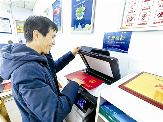 11月4日,在义马市自然资源和规划不动产登记中心窗口前,工作人员接过群众递来的不动产权证书,免费为办事群众复印登记材料,脸上笑意满满;并同步提供免费EMS快递寄送服务——从材料复印到证书送达,“零费用、少跑腿”的暖心举措,让不动产登记服务既有效率,更有温度。 贺斌 摄