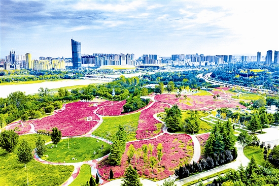 11月5日,“天鹅之城”三门峡,天鹅湖国家城市湿地公园虢都花海内,5万平方米粉黛乱子草绚烂绽放,与市区建筑交相辉映,犹如一幅被大自然调色的水彩画卷。 杜杰 摄