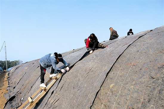 日前,在湖滨区会兴街道西河底村,种植户忙着为大棚覆盖保温“棉被”。这层“保暖衣”能有效维持棚内适宜温度,保障蔬菜正常生长,为蔬菜稳产保供及种植户增收筑牢根基。 本报记者 张明 摄