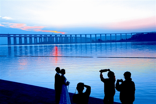 深秋黄昏,黄河之畔像被轻纱笼罩,浩吉铁路大桥雄浑的轮廓被镀上温暖的金边,夕照将粼粼波光染成橙粉。一对新人选择这壮丽的自然与工程奇观作为背景,在摄影师指引下,将爱的身影定格于黄河与长桥之间。 姚书勤 摄