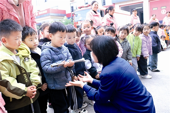 11月4日,陕州区消防宣传人员在指导陕州区实验幼儿园的幼儿感受破拆装备的重量,教育引导幼儿触摸感知的方法,启发他们树立消防安全意识。 张平乐 白姣姣 摄