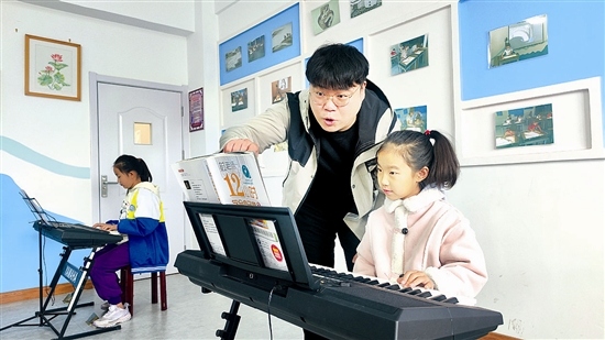 11月8日,三门峡市湖滨区青少年活动中心内,秋季公益课电子琴课堂上老师正在悉心指导学生。