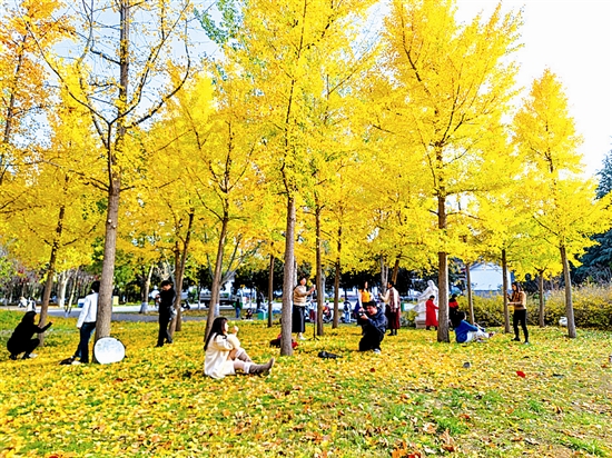 连日来,三门峡天鹅湖国家城市湿地公园周公岛上的银杏林换上“黄金甲”,风一吹下起漫天“银杏叶雨”,众多游客来此拍照打卡,邂逅一场初冬童话奇遇。 本报记者 单义杰 摄