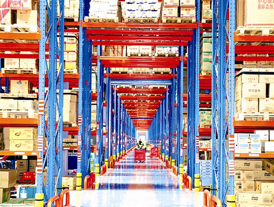11月11日,在河南省南阳市万德隆大型综合产业园物流配送中心,工人在仓库运送商品。 又一个“双十一”到来,各地电商、物流等相关企业全力运转,应对网购物流高峰。 新华社发