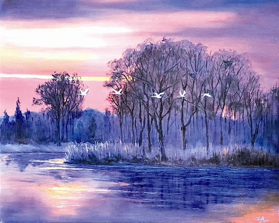 河南省美术家协会会员、三门峡市美术家协会副秘书长卫磊,则以写实与印象派融合的风格,描绘出天鹅湖最美的暮色。黄昏的天空晕染着紫粉与橙黄的渐变,枯树与残雪铺就北方冬日的底色,振翅的白天鹅则是灵动的注脚。他说:“这种风格既精准还原了三门峡天鹅栖息地的自然风貌,又通过艺术化的色彩与光影处理,传递出‘天鹅之城’生态之美与人文情怀。”在他眼中,天鹅是三门峡“生态留白”的具象符号,黄河湿地拥抱着来自西伯利亚的精灵,而天鹅也以白羽擦亮了这座城的冬日。
