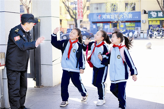 | 自灵宝市第一小学推行“微笑、点赞、问好”三张校园文明“名片”以来,这些看似简单的行为已成为校园常态。图为近日学生在校门口向门卫伯伯问好。 李晓妮 王 摄 |
