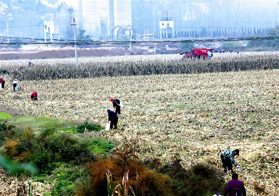 连日来,我市天气晴好,利于农作物抢收。11月11日,在灵宝市函谷关镇梁村,村民们趁晴好天气抢收玉米,确保颗粒归仓。 本报记者 何英杰 摄