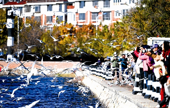 近日,天津市迎来候鸟迁徙高峰,大批海鸥从寒冷的西伯利亚迁徙至滨海新区老码头附近的海河岸边越冬,每天栖息在这里的海鸥达到上千只,吸引了许多游客前来观赏。 新华社记者 赵子硕 摄
