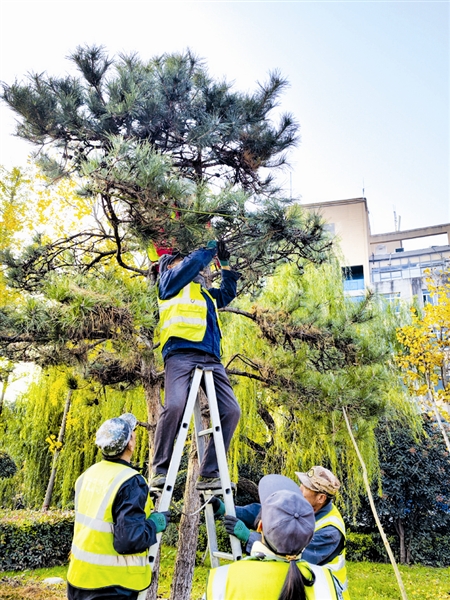 随着白天鹅旅游季的到来,我市对天鹅湖国家城市湿地公园及其周边的门牌、道路、绿植等进行维修保养,确保以最亮丽的城市面貌迎接八方游客。图为11月12日,园林工人对公园大门周边的松树进行修剪,并做成盆景艺术品。 本报记者 侯鹏云 摄
