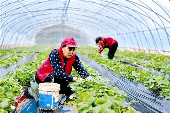 近日,湖滨区崖底街道西贺家庄村草莓种植园内,工作人员在温室大棚里精心管护草莓苗,为草莓苗茁壮成长保驾护航。 本报记者 张明 摄
