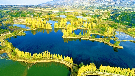 近日,灵宝市西阎乡沙河湿地迎来初冬盛景,航拍镜头下,成片杨树尽披“金甲”,金黄枝叶与碧蓝湖水相映成趣。 文一 摄
