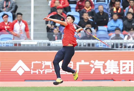 11月18日,河南队选手胡浩然在比赛中。最终,他获得冠军。当日,第十五届全国运动会田径项目男子标枪决赛在广州举行。 新华社记者 周牧 摄