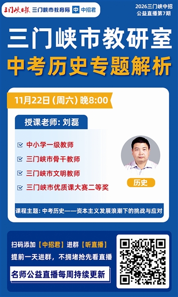 公益直播课每周一期,将针对中考各科重难点进行答疑解惑。各位老师、家长、学生可识别左下方二维码加“2026三门峡中招君”为好友,进群听课。本周六晚8:00,不见不散。 (本报记者)