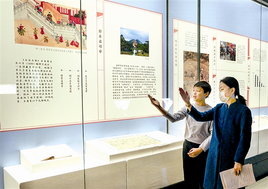 11月22日,一名学生(左)在国家典籍博物馆内学习如何介绍中华优秀传统文化。