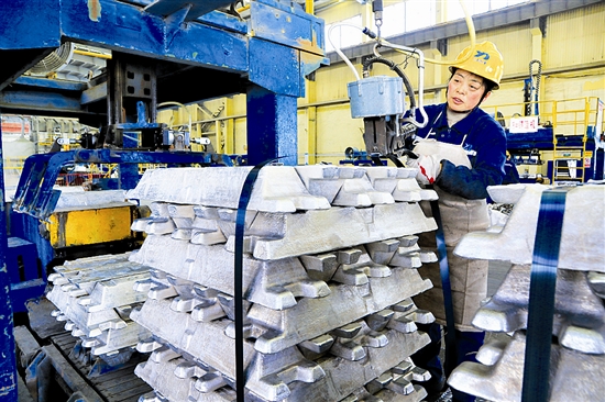 11月25日,在位于陕州区的河南恒康铝业有限公司生产车间内,生产线全速运转,工人有条不紊地对铝锭进行包装作业,呈现出一派热火朝天的生产景象。今年以来,该公司产销势头强劲,1至10月实现营业收入35.34亿元、税收1.13亿元。 本报记者 王建栋 摄