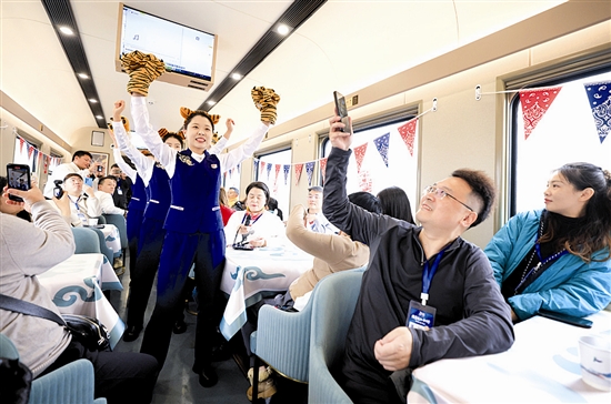 11月26日,工作人员在Y783次“悠享龙江·银旅号”旅游列车上为旅客表演萌虎韵律操。