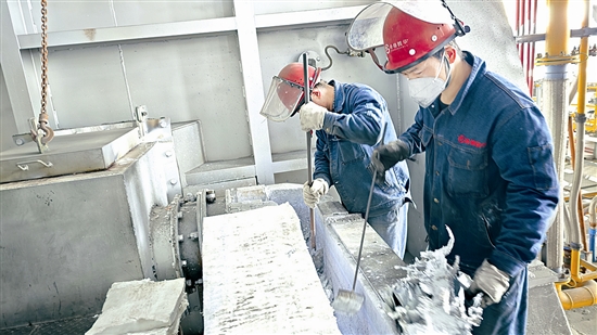 进入四季度,渑池县先进制造业开发区内的河南希格腾华新材料有限公司开足马力促生产,确保全年任务圆满收官。图为11月27日,工人在车间清理熔液流槽中的废铝。 本报记者 王超 摄