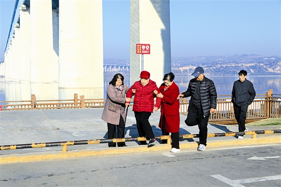 11月21日,三门峡黄河公铁两用大桥下,几位同行者细心搀扶老人漫步河畔。冬日暖阳下,一行人沉浸式欣赏黄河美景,欢声笑语中温情而惬意。 本报记者 王建栋 摄