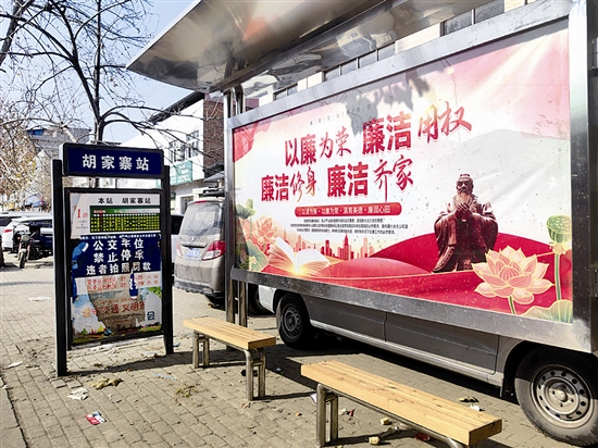 “廉始于心 政载于勤”“以廉为荣 廉洁用权 廉洁修身 廉洁齐家”……走进卢氏县1路公交车沿线各公交站亭,简洁有力的廉洁标语、图文并茂的漫画故事、饱含深意的经典诗词映入眼帘。“这些宣传语朗朗上口,画面也好看,不知不觉就记住了!”近日,正在胡家寨站(如图)候车的市民张女士驻足观看,连连称赞。