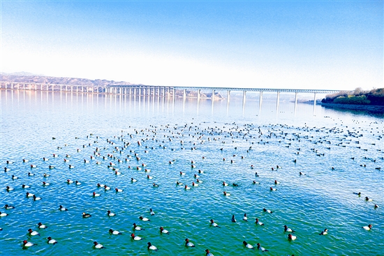 12月4日,在黄河湿地陕州区段,成群的红头潜鸭在河水里觅食、嬉戏,构成一道美丽的风景线。 本报记者 王建栋 摄