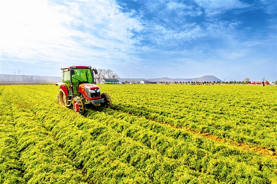 12月2日,在灵宝市黄河滩涂万亩蔬菜基地,西阎乡的胡萝卜喜获丰收。田地里,犁萝卜机来回穿梭,采收工人去缨、装袋,一辆辆大货车正等着装车外运,一派热火朝天的丰收景象。 刘涝慈 摄