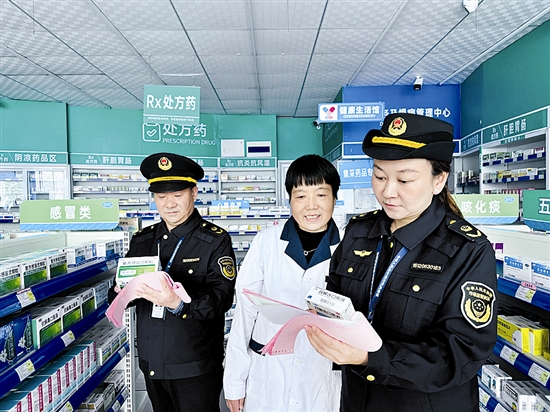 为了规范药品零售市场秩序,切实保障群众用药安全,近期,渑池县市场监督管理局组织执法人员对辖区各零售药店开展专项检查,重点聚焦药品采购、陈列、销售全环节合规性,织密药品安全“防护网”。图为12月2日,执法人员在某药店现场查验药品购进票证。 梁小卫 摄