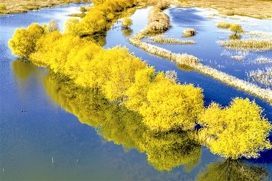 12月3日,三门峡黄河湿地灵宝市函谷关镇孟村段呈现绝美景色,清澈的水面如同一面巨大的镜子,完美地倒映出岸边金黄的树木,构成了一幅如诗如画的自然画卷,尽显冬日的独特韵味与宁静祥和。杜杰 摄
