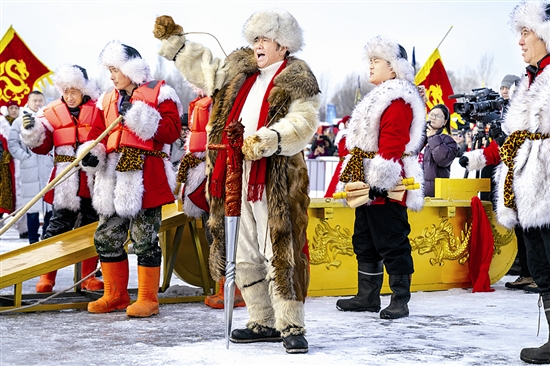 12月7日,在第六届哈尔滨采冰节现场,“冰把头”带领“采冰汉子”去采头冰。