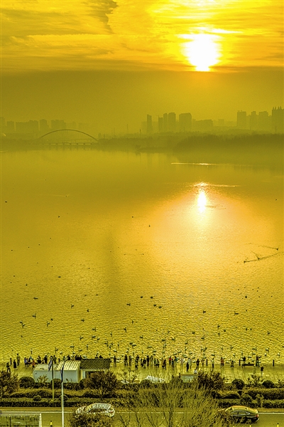 12月7日,正值周日,来自全国各地的游客一大早就到天鹅湖国家城市湿地公园等候,欣赏、拍摄旭日暖阳下的白天鹅。