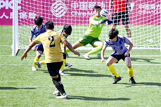 当日,在全国第十二届残疾人运动会暨第九届特殊奥林匹克运动会盲人足球项目男子组小组赛中,广东一队3比2战胜天津队。 新华社记者 陈浩明 摄