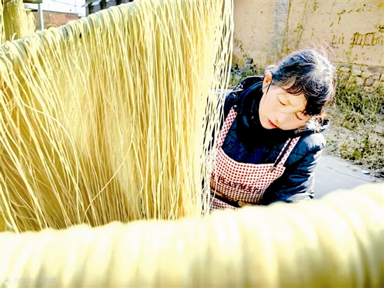 红薯收获后,除冬藏外,群众还积极加工成粉面,制作成粉条,从而提升红薯的经济效益。图为12月11日,渑池县仰韶镇阳光村一名群众在晾晒红薯粉条。 王家臣 摄