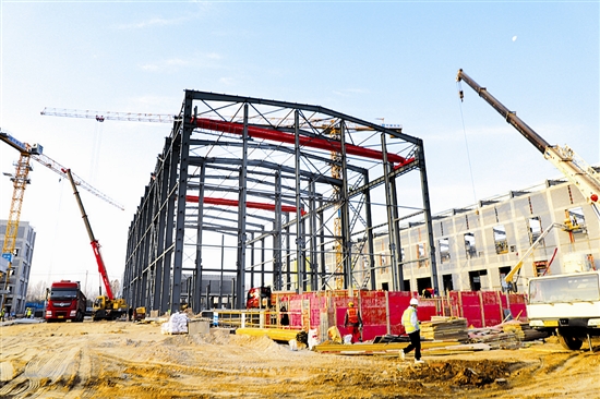 12月12日,在市城乡一体化示范区(高新区)河南金渠钼业有限公司投资建设的年产6000吨高纯钼产品项目建设现场,工人正在搭建厂房。