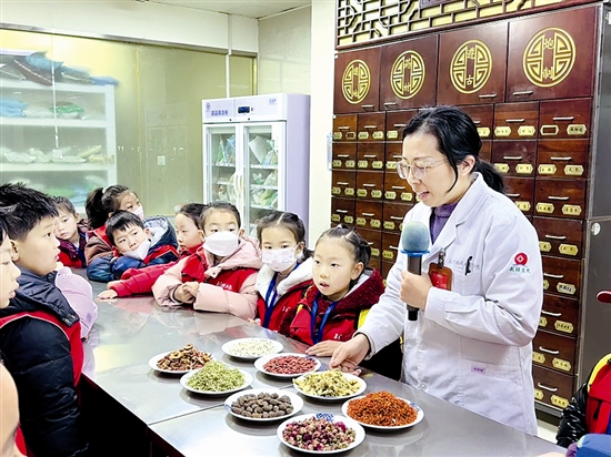 12月20日,三门峡日报小记者走进三门峡武强中医院探索中医的奥秘。图为医生为小记者科普中药知识。 程倩 摄