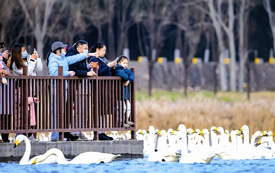12月20日,游客在河南省三门峡市天鹅湖国家城市湿地公园观赏白天鹅。