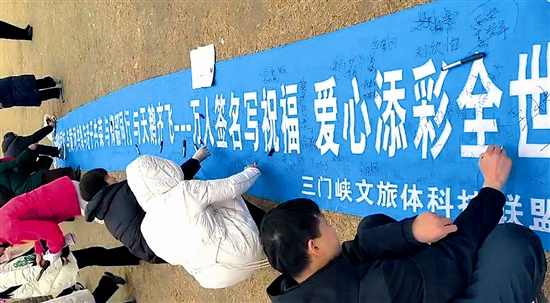 12月21日,一场万人签名送祝福活动在三门峡天鹅湖国家城市湿地公园一号码头举办。游客在签名布上留下签名与祝福,让美好祝愿随天鹅翱翔,用点滴爱心为世界增添温暖。 本报记者 徐伟 摄