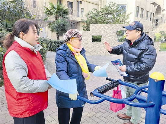 近日,湖滨区前进街道华创社区开展反诈宣传活动。工作人员深入社区,发放宣传页、讲解经典案例,揭露常见网络诈骗手段,提醒居民牢记“不听、不信、不转账”原则,遇诈及时报警,维护自身权益。 张明 张雨萌 摄