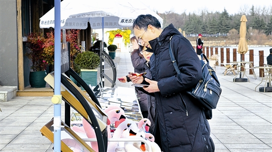 连日来,我市“白天鹅旅游季”持续火爆,不仅吸引来自全国各地的游客前来打卡,也带火了周边文创产品。图为12月23日,在三门峡天鹅湖国家城市湿地公园,游客正在挑选心仪的白天鹅文创产品。 尚栋 摄