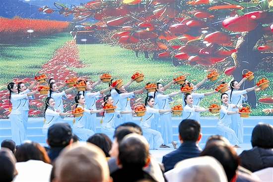 12月16日,2025年河南“村晚”大联欢暨全国“四季村晚”示范展示河南济源柿槟新村“冬季”村晚活动在济源市克井镇柿槟新村举办。三门峡市文化馆选送的舞蹈《丰收果香》参与展演,以舞蹈语言描绘出丰收时节的喜悦图景,尽显豫西乡村的质朴与活力。图为演出现场。 芦山 摄