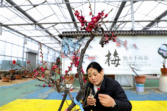 12月24日,在市城乡一体化示范区(高新区)梅香缘梅花专业合作社疏影馆内,一名工作人员对梅花枝丫进行修剪。