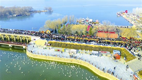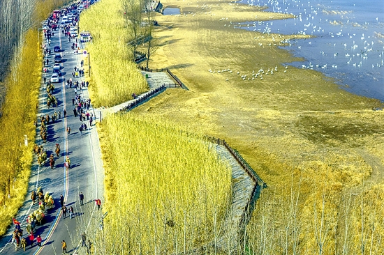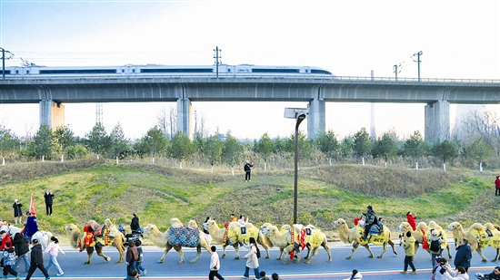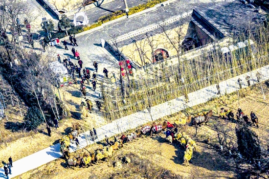 回溯2025年12月25日,驼队自豫陕界灵宝段缓缓进入三门峡。行程中,一幕幕古今交融的画卷徐徐展开:千年雄关函谷关前,迎宾仪式庄重典雅,重现古关驿道的迎宾盛景。陕州地坑院里,非遗互动温情脉脉,队员们沉浸式领略“地平线下古村落”的独特魅力,与本地艺人共话文化传承。沿黄生态廊道上,公铁两用大桥巍然耸立,高铁疾驰而过,与昂首前行的驼队相映成趣。天鹅湖国家城市湿地公园内,驼影与大天鹅同框嬉戏,勾勒出这个冬日里最动人的画卷。在崤函古道石壕段遗址,深深嵌入石中的千年车辙让驼队驻足注视,仿佛触摸到“两京锁钥”昔日的脉搏。